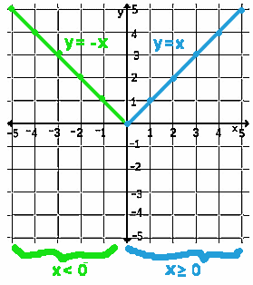 | Defined as a piece-wise function, the absolute value is shown here in green and blue. Each piece is a line. Each piece has its own domain. Some times the absolute value is written as a piece-wise function using 3 pieces.