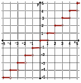 Think of steps. Think of paying sales tax, or income tax, or buying postage stamps. Think of paying a nice round number for all services or numbers up to the next round number. Think of the greatest integer less than or equal to the number in question. That's the greatest integer function. Its symbol is [[x]]. Its graph looks like steps. The function has discontinuities, breaks, going from one "step" to the next. In each interval, the lower endpoint is included (as shown by a colored in circle) and the upper endpoint (as shown by a hollow circle) is not included because it is included in the next "step."