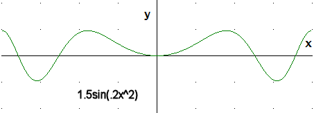In the first composition, 1.5sin(.2x²), the augument of the sine is a flattened parabola which gives the graph symmetry and decreases the "speed" at which the sine goes through its cycle. The multiplication of this by the constant 1.5 gives the function a bit more height compared to the height of the sine function.
