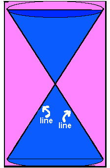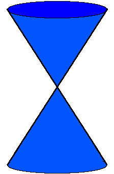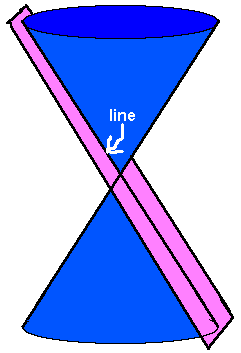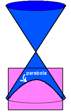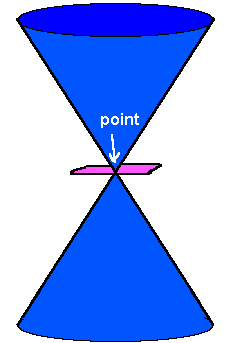 | Cut the Cones Perspective Return to the Individual Pictures shown above and click on each picture so you are better able to examine how a plane passing through one or more cones creates the black string of points called a conic. Examine the pictures and contemplate the angle at which the plane cuts the cones. Examine the picture and summary below for a complete analysis. |