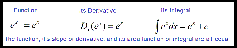 - If e is the base of a power function, the function, its slope function (derivative), and its area function (integral) all the same. In