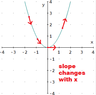 | Slope Function, m, f'(x), dy/dx: m = 2x