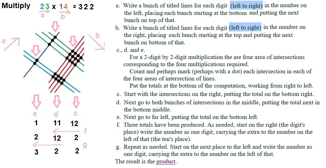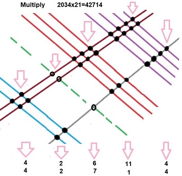 To multiply two numbers, in specific locations draw a bunch of lines for each digit, count the intersections, carry if needed, and you have a product. ![]() This time in more detail. Multiplication by lines permits one to multiply two numbers by drawing a bunch of lines in specific positions for each digit of each numbers being multiplied, counting the numbers of intersections of the lines, and completing the multiplication completely by addition. Note:On this page the words multiplier (the number "doing" the multiplication) and multiplicand (the number being multiplied by the multiplier) are not used. Their positions may be switched at will by the commutative property of multiplication. |
