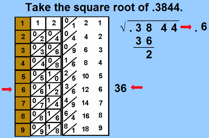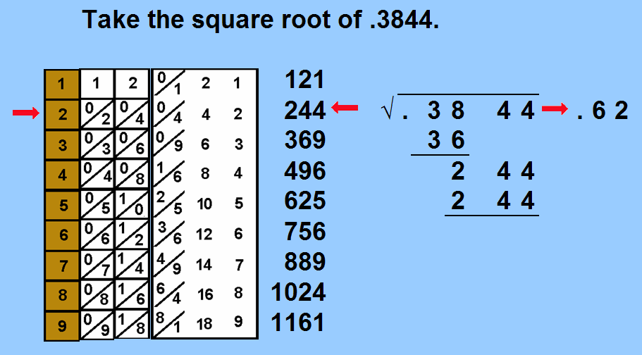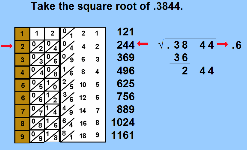 From the decimal, to the left with whole numbers and also to the right with decimal numbers, group digits of the radicand in pairs. |