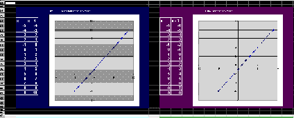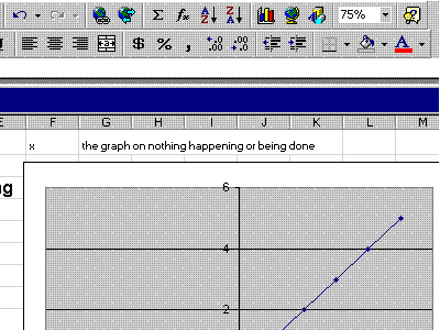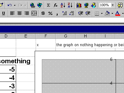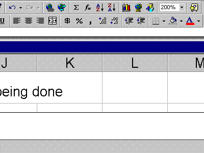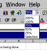 |   | Zoom on the spreadsheet is similar to zoom on a calculator -- it makes larger or smaller the view on the screen. ![]() The zoom menu permits the user to choose the scale at which the spreadsheet page is displayed --- regular at 100%, enlarged at 200%, or smaller scale and larger area at other percents. See the examples below. To change the viewing window, click on the down arrow, highlight the desired scale, press enter. The viewing window may be changed at anytime one is not in the middle of doing something else -- typing a formula, making a graph, etc.