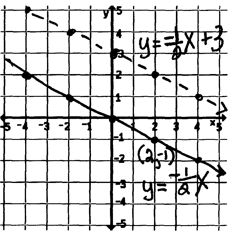 I have y= -(1/2)x+3. Who has a line parallel to this passing through (2,-1)? |