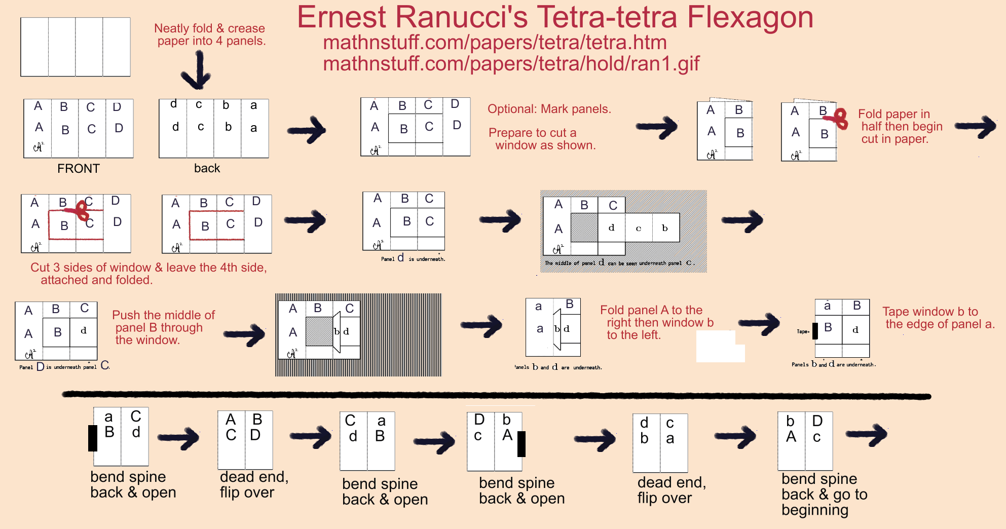 Once Upon A Time, in the 1970s at an NCTM meeting, I sat in a room with a hundred other math teachers and folded my first tetra-tetra flexagon. Ernest Ranucci guided us through the paper-folding process and each of us (I think) experienced the joy of making something so beautiful and simple. The wonder of that moment and the cut and folded flexagon came home with me. The directions for its assembly did not. I experimented for quite some time before my new flexagon did what I wanted it to do. So, I take blame for the graphics and the directions but not for the idea. |